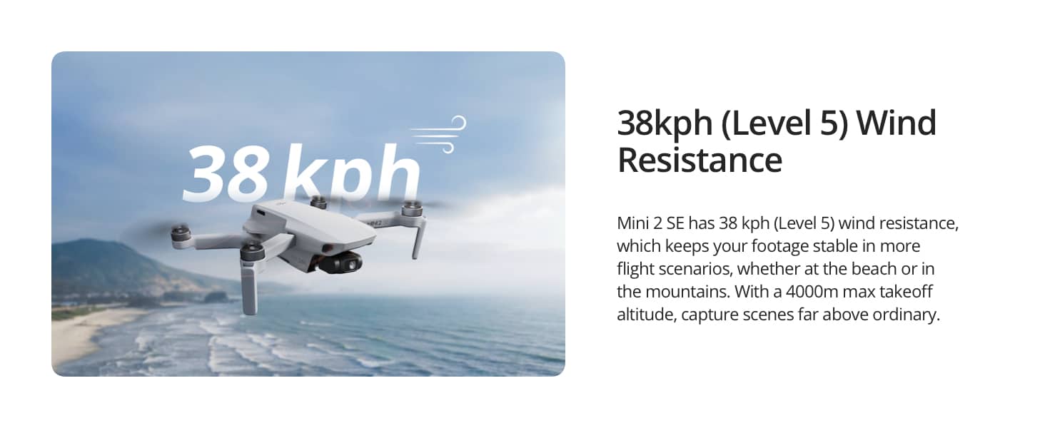 - Rezistență la Vânt de 38 km/h (Nivel 5) – DJI Mini 2 SE zboară cu o stabilitate de încredere chiar și în vânturi de până la 38 km/h, permițându-vă să zburați și să capturați conținut mai fiabil în mai multe locuri.