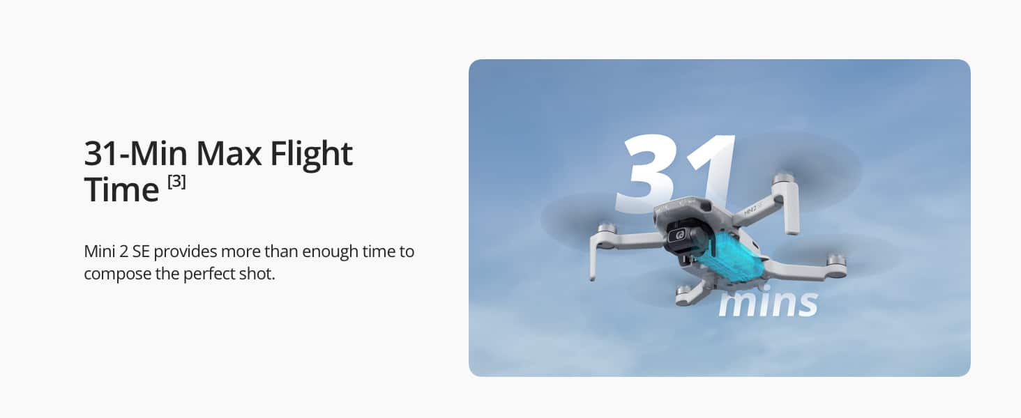 - Timp Extins de Zbor – Bucurați-vă de zboruri mai lungi cu DJI Mini 2 SE, care oferă un timp maxim de zbor de 31 de minute. Combo-ul include două baterii de zbor inteligente suplimentare (trei în total) pentru până la 93 de minute de zbor total*. Explorați și creați mai mult.