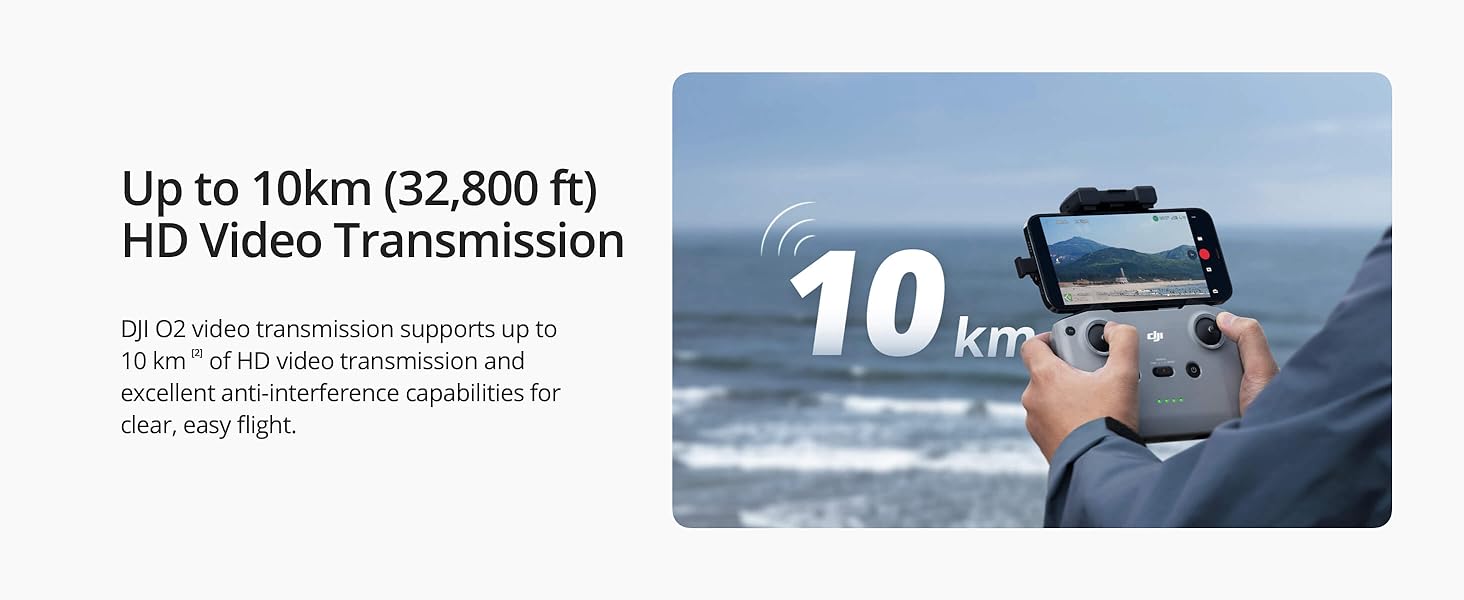 - Transmisie Avansată OcuSync – Beneficiați de o transmisie maximă de 10 km pentru a zbura cu încredere mai departe și pentru a captura mai mult. Comparativ cu Wi-Fi, DJI OcuSync este semnificativ mai puternic, oferind o transmisie îmbunătățită și compatibilități mai puternice împotriva interferențelor.