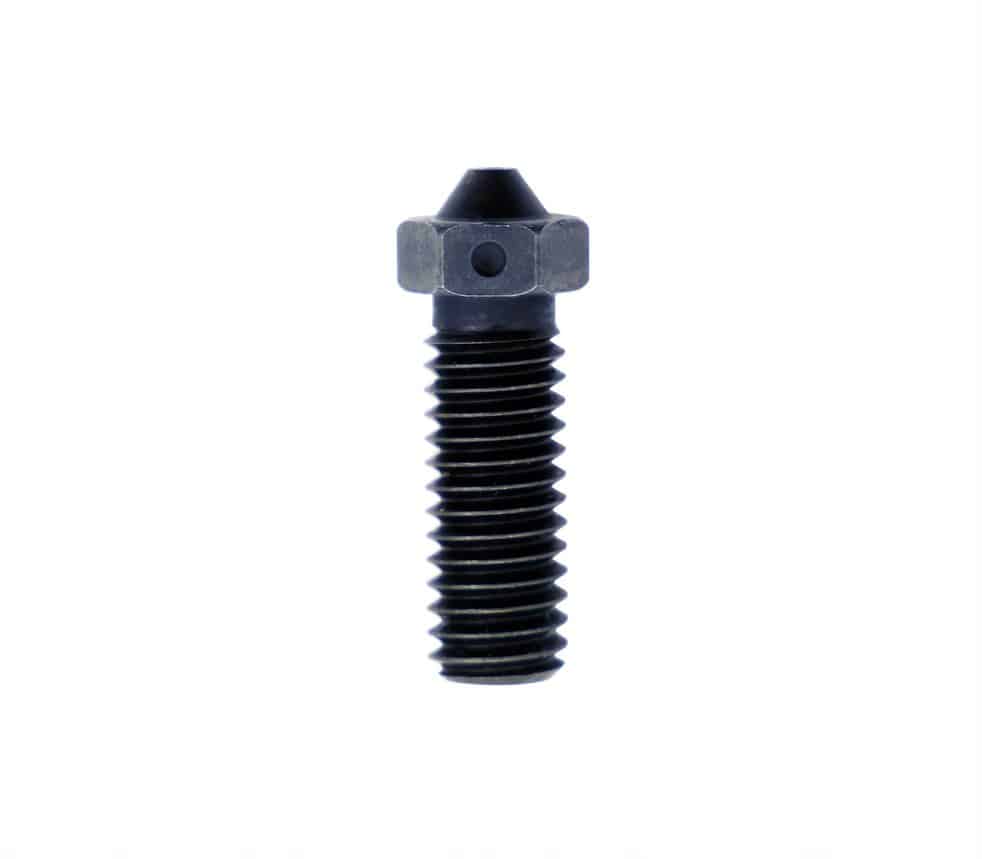 Una dintre caracteristicile esentiale ale acestei duze este materialul din care este realizata. Otelul scule cu duritate 68HRC asigura rezistenta excelenta impotriva uzurii, ceea ce este esential atunci cand se imprima cu materiale abrazive precum compozitele cu fibra de carbon, fibra de sticla, bronz sau cu materiale tehnice avansate precum PEEK sau PEI. Acoperirea cu nichel creste rezistenta la coroziune si protejeaza suprafata duzei in conditii de temperaturi foarte ridicate. Stratul WS2 cu proprietati polifobice permite alunecarea usoara a filamentului, reducand aderenta reziduurilor si eliminand riscul depunerilor interne care pot provoca blocaje.