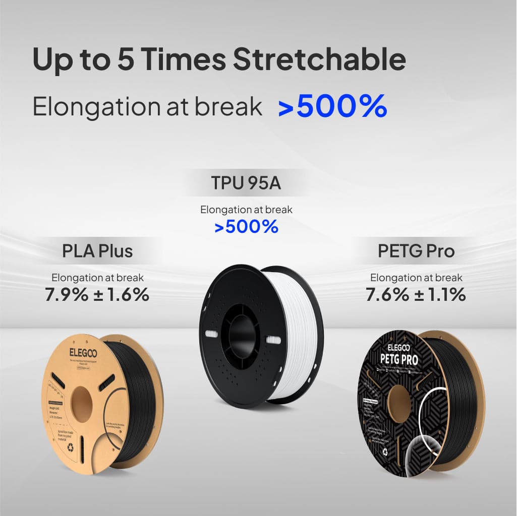 Una dintre cele mai importante caracteristici ale filamentului TPU este elasticitatea sa remarcabila. Filament Elegoo TPU 95A 1.75mm, 1kg ofera o rata de alungire de peste 500 la rupere, ceea ce inseamna ca piesele imprimate pot fi indoite, rasucite si intinse in mod repetat fara a se deteriora. Aceasta proprietate il face ideal pentru aplicatii precum garnituri, sigilii, amortizoare, protectii pentru cabluri, piese pentru industria auto, componente robotice sau echipamente purtabile. Rezistenta mare la impact il diferentiaza de materialele rigide, asigurand o durata de viata extinsa a pieselor in conditii de exploatare dificile.