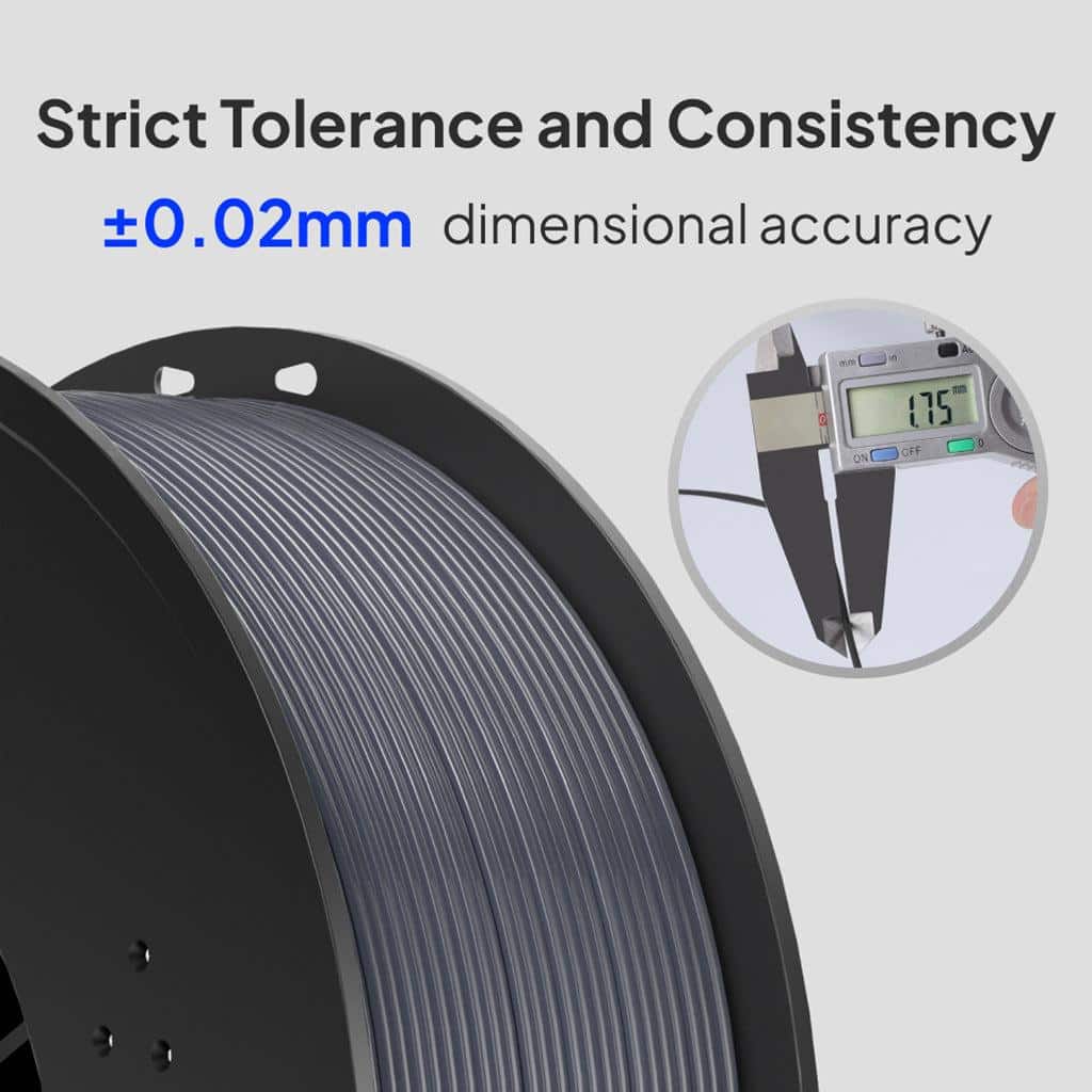 Unul dintre marile avantaje ale filamentului este toleranta dimensionala stricta de aproximativ plus minus 0.02 mm. Acest aspect garanteaza o extrudare uniforma, fara fluctuatii, prevenind astfel obturarea duzei si asigurand un flux constant de material. Filament Elegoo TPU 95A 1.75mm, 1kg ofera o calitate superioara a suprafetei si detalii precise chiar si pentru obiecte complexe, cu geometrie fina sau structuri flexibile delicate.