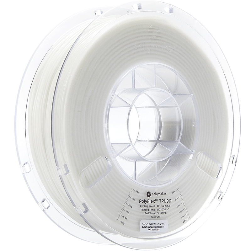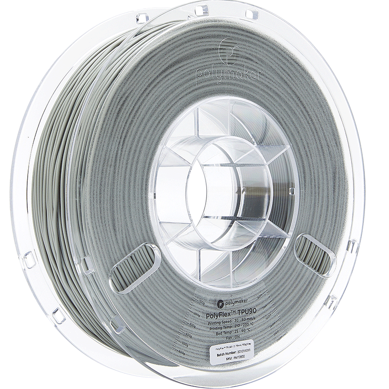 Filament Polymaker PolyFlex TPU 90A, 1.75mm, 750g ofera flexibilitate ridicata, durabilitate si imprimare usoara, fiind ideal pentru proiecte functionale, aplicatii exterioare si produse purtabile datorita rezistentei UV si certificarii sigure pentru contact cu pielea.