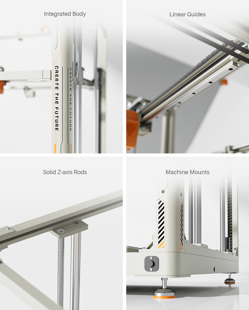Construită din aluminiu CNC-machined, Imprimanta 3D Elegoo Orange Storm GIGA are o structură solidă și stabilă, ceea ce îi conferă durabilitate în timp. În plus, greutatea de 104 kg și baza de lucru eficientă asigură o stabilitate excelentă, esențială pentru imprimarea de dimensiuni mari.