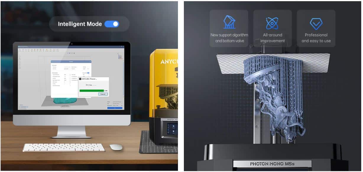 Mod inteligent: În noua versiune a software-ului de feliere Anycubic Photon Workshop 3.1, opțiunea „Intelligent Mode” poate potrivi în mod inteligent parametrii de expunere în funcție de detaliile și dimensiunea modelului, reducând riscul de eșec al imprimării cauzat de setările necorespunzătoare ale parametrilor.
